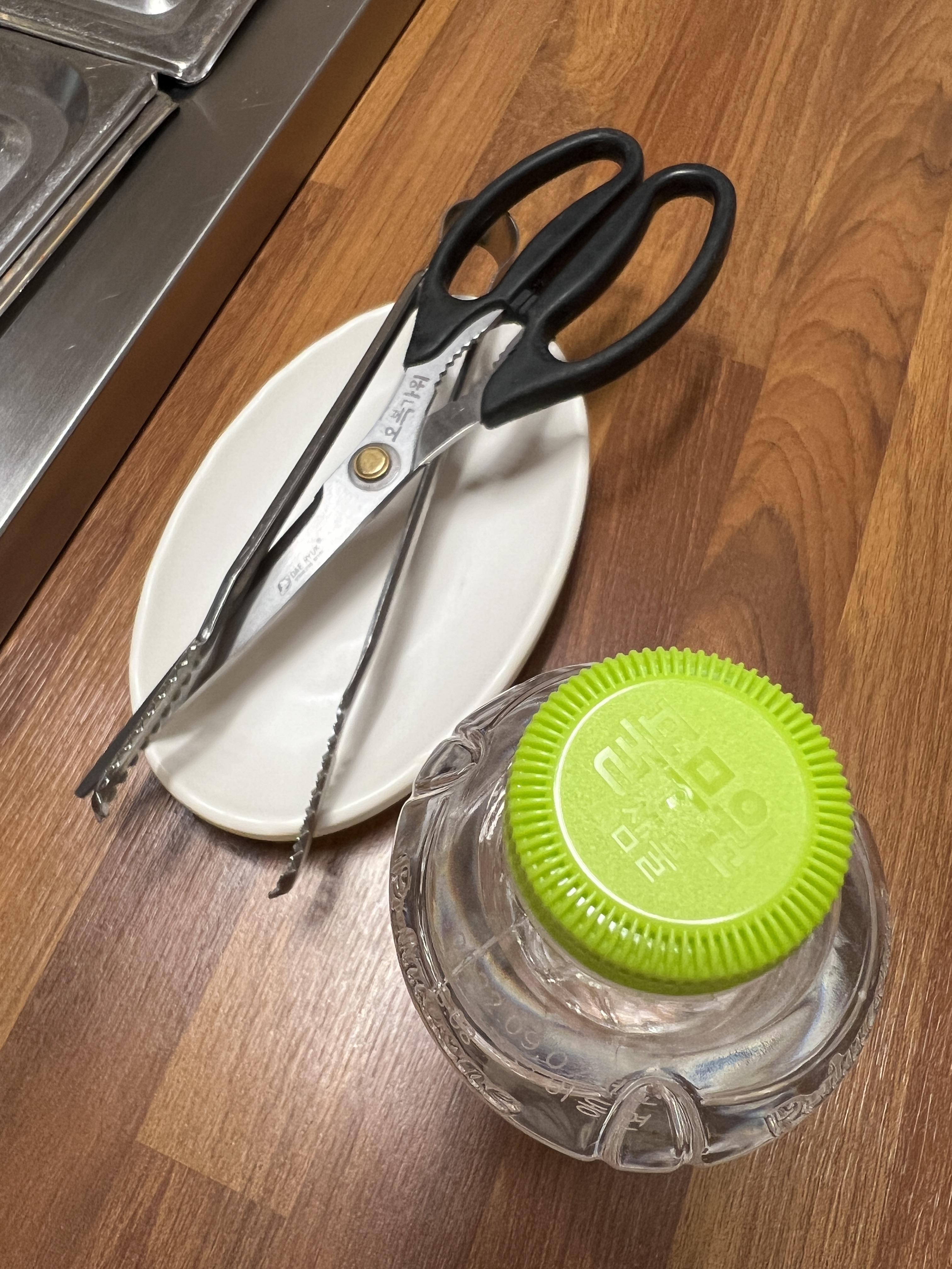 물은 이렇게 풀무원 생수로 주고 가위랑 집게도 김치랑 깍두기 셀프로 이용하라고 주시더라구요.