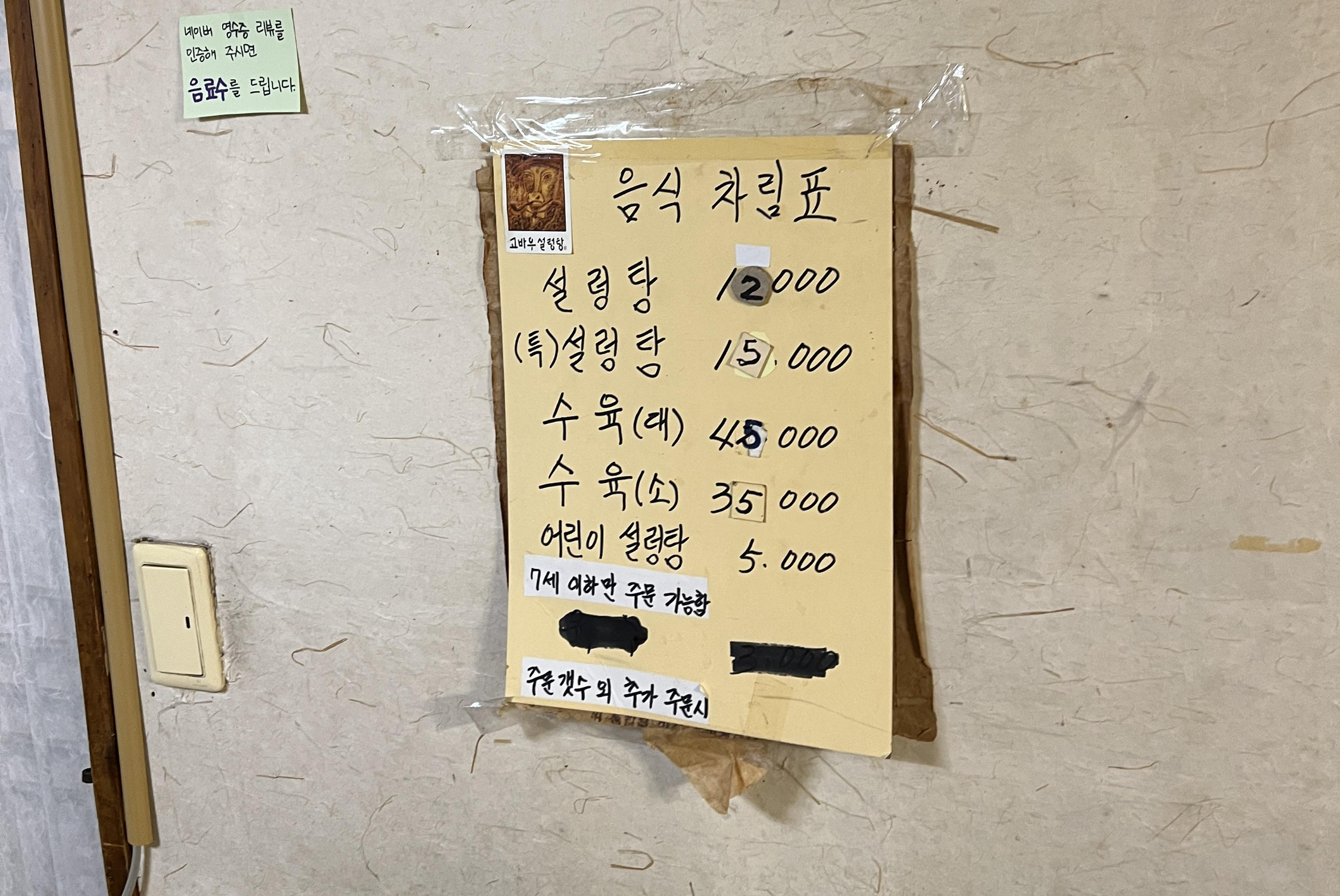 메뉴는 심플해요. 설렁탕 또는 수육 이렇게 있고 어린이 설렁탕은 7세 이하만 주문이 가능하다고 적혀 있어요.