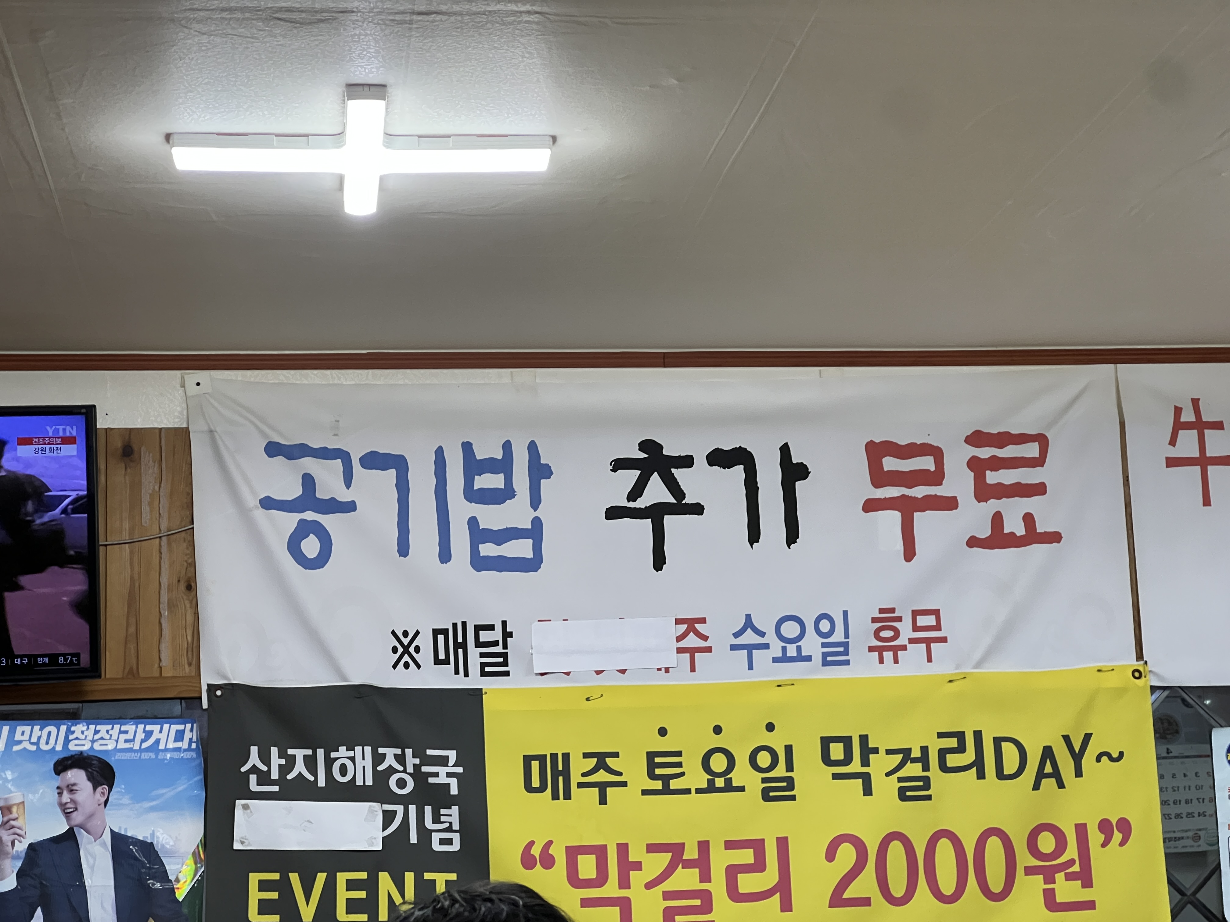 공기밥 추가는 무료라고 적혀 있고 매주 토요일 막걸리 데이라고 해서 막걸리를 2,000원 팔고 있어요.