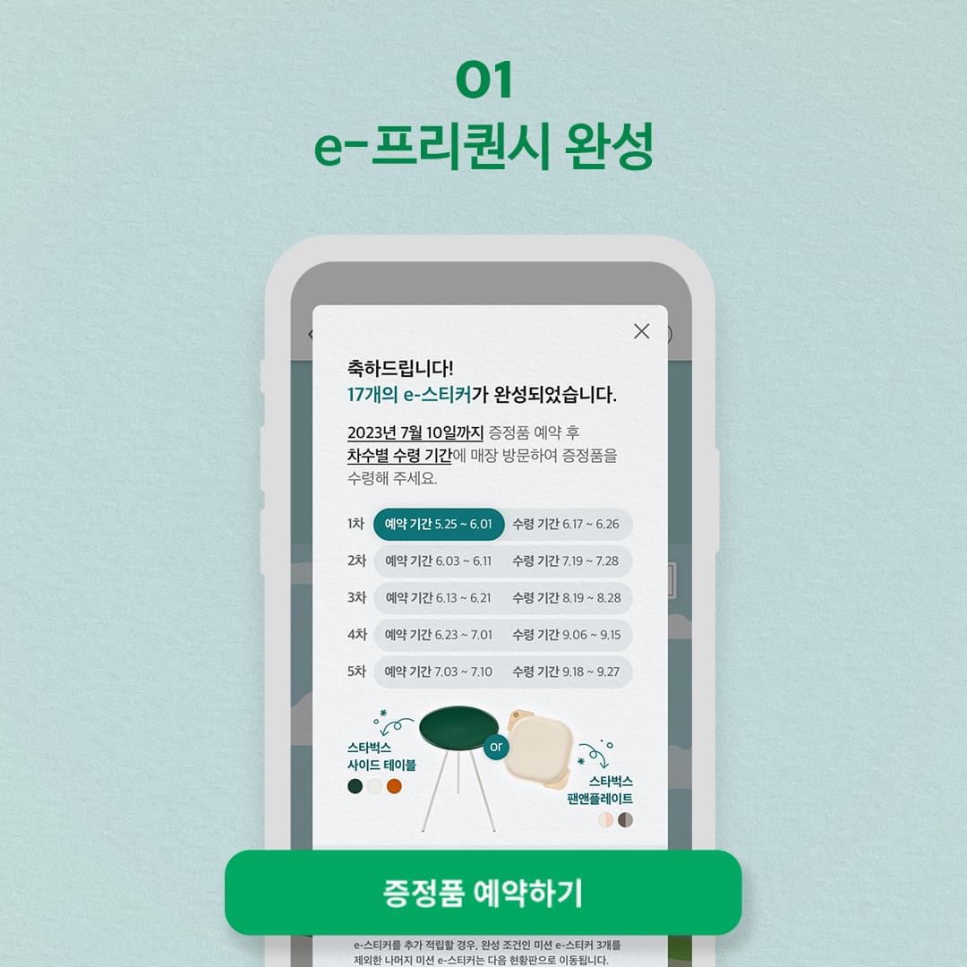 이렇게 하면 스타벅스 e 프리퀀시를 수령할 수 있어요. 아직 시작도 안했지만 너무나도 기대되고 총 5가지 다 받고 싶네요. 근데 17잔 먹는게 만만치 않고 가격도 실제 구입하는 가격이랑 비슷하기 때문에 잘 고민하시는걸 추천드리고 싶네요.
