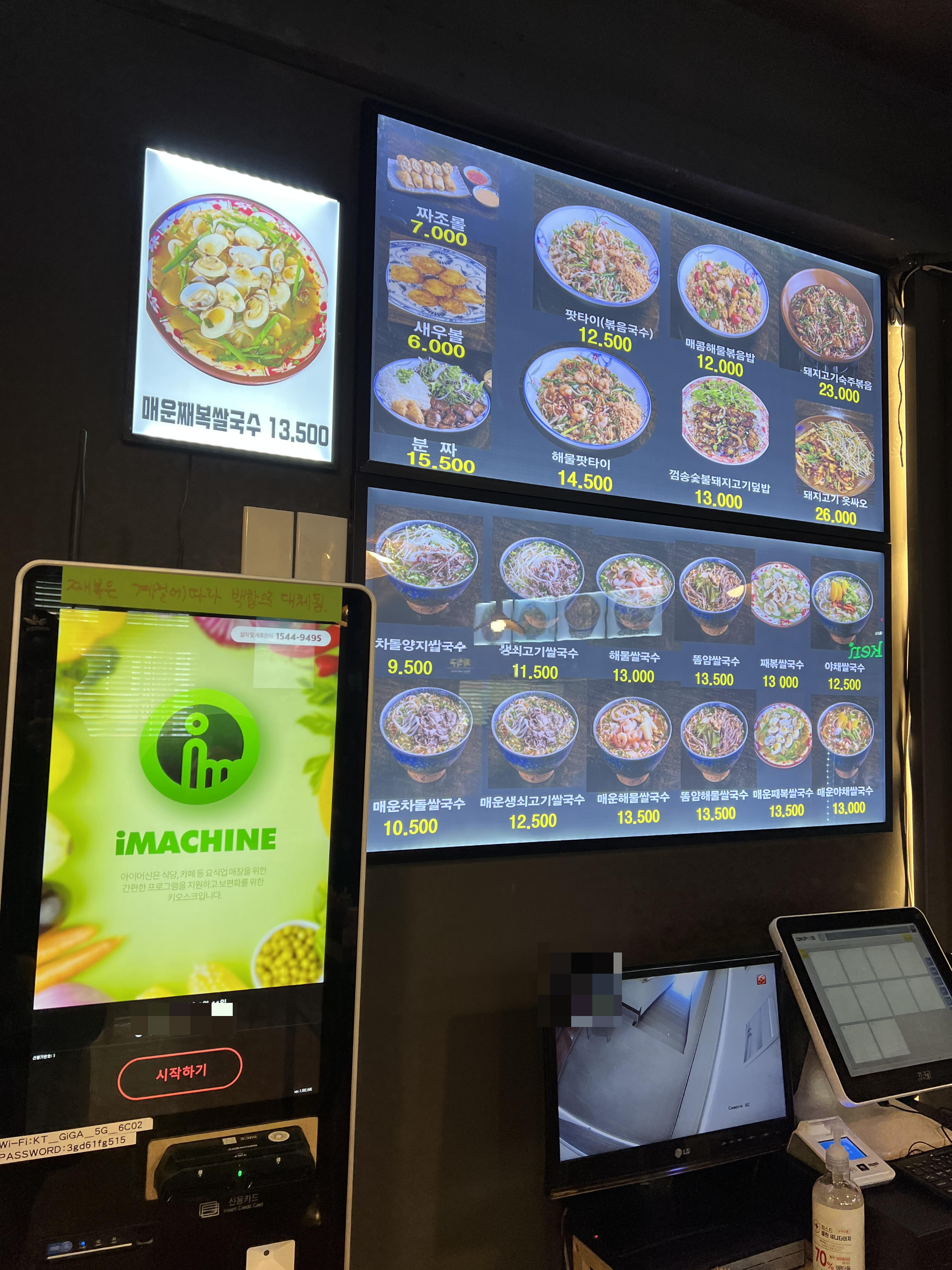 입구에 들어가자마자 이렇게 키오스크가 있고 그 위에 메뉴판이 있어요.