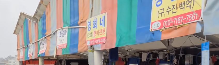 거기에 주희네 현철네 공자네 경민네 수진네 재민이네 명진이네 민호네 철이네 등등 이렇게 해산물 세트를 판매하거나 매운탕 문어 라면 이런 부분을 파는 가게가 앞에 따로 있어요.