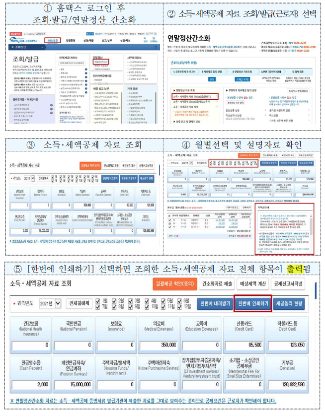 소득·세액공제 자료 조회·출력 방법도 위에처럼 하시면 되고 한번에 인쇄하기 선택 후 팝업이 나오면 주민번호 출력 여부가 나오니깐 확인하시고 출력하시면 주민번호 뒷자리까지 다 보이니깐 참고해주세요.