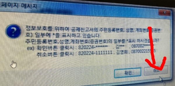 위에 사진처럼 공제신고서를 출력할때 확인을 누르면 주민번호 뒷자리가 별표시 나오기 때문에 주민번호가 다 보여지게 출력을 하실거면 팝업 메시지 설명처럼 취소버튼을 클릭 해주세요.