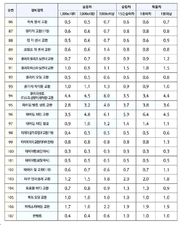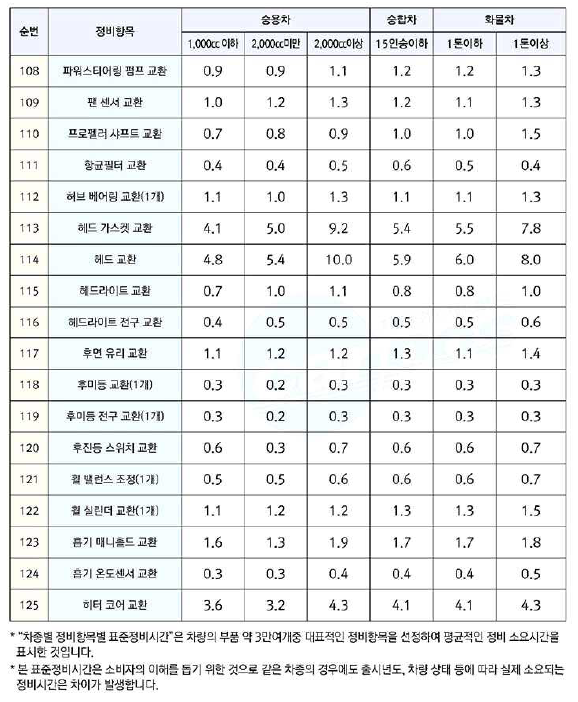 이렇게 3가지로 비교 할 수 있고 거기에 보시면 표준정비시간이 다 나와 있어요. 차종이나 해당 부분에서 차이가 있지만 기준이 있다고 보시면 되는거죠. 위에 자료는 한국 자동차전문정비사업조합에 나와 있는 표준정비시간을 보여드리는거예요.
