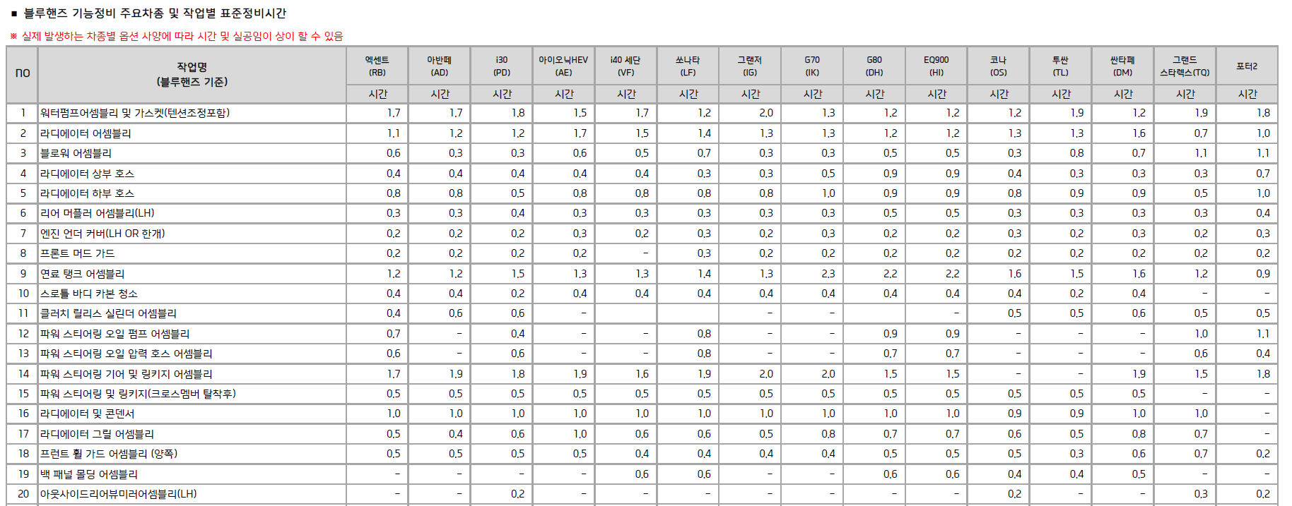 ◾ 블루핸즈 주요 작업별 표준정비시간