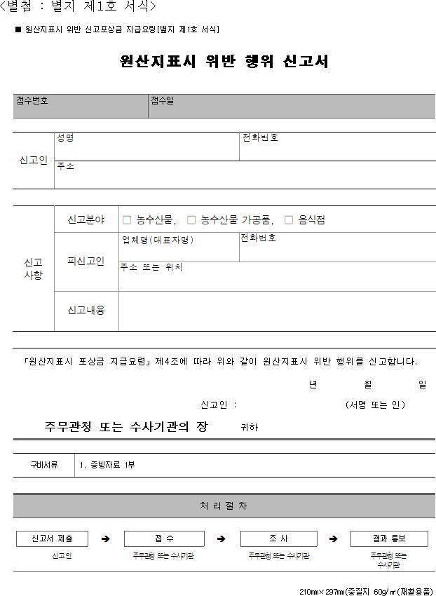 6. 원산지 표시 신고포상금 지급신청서를 작성해서 보낸다.