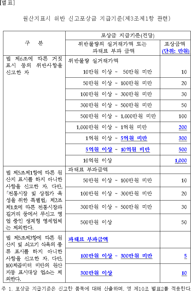 원산지표시 위반 신고포상금 지급기준은 정해져 있어요.