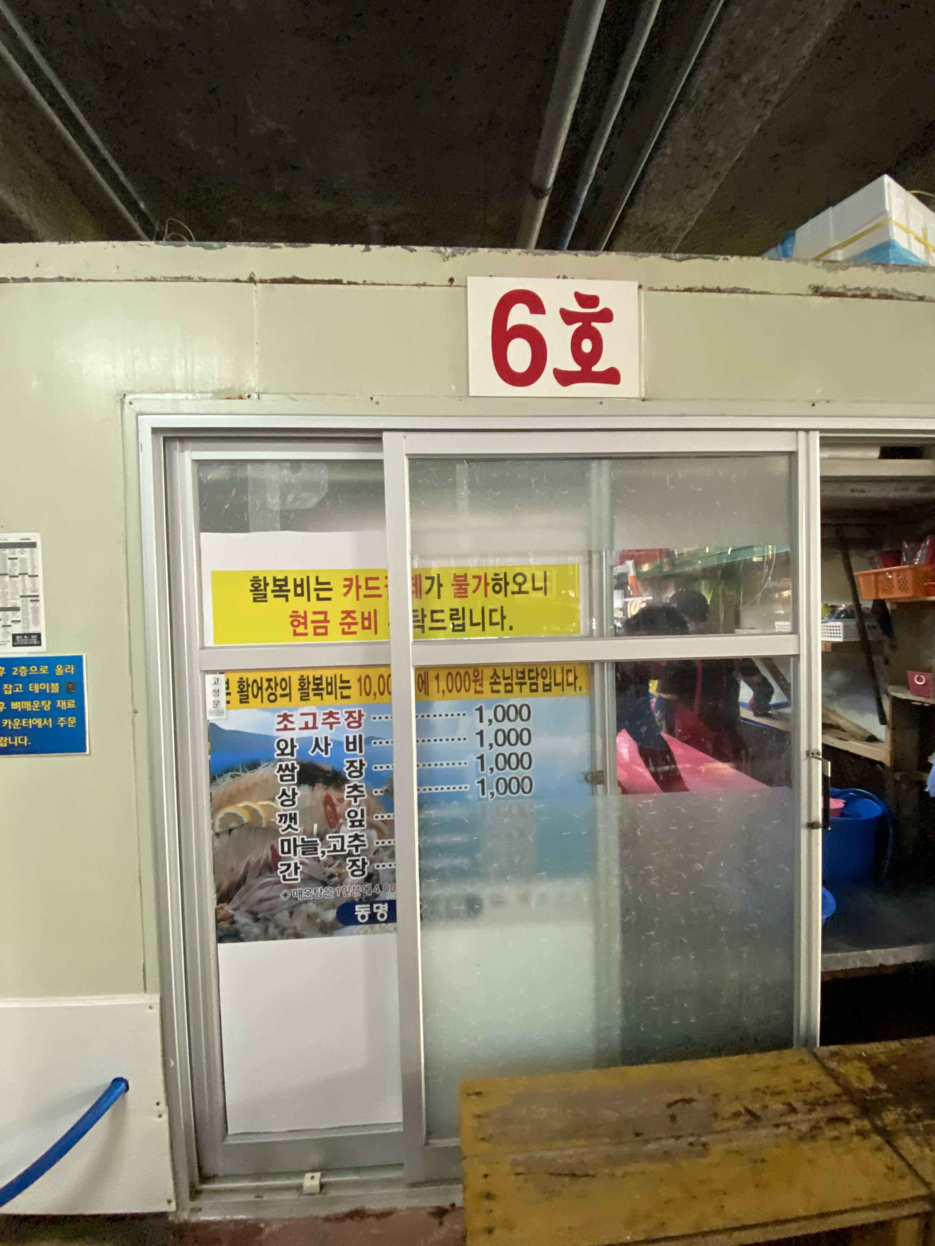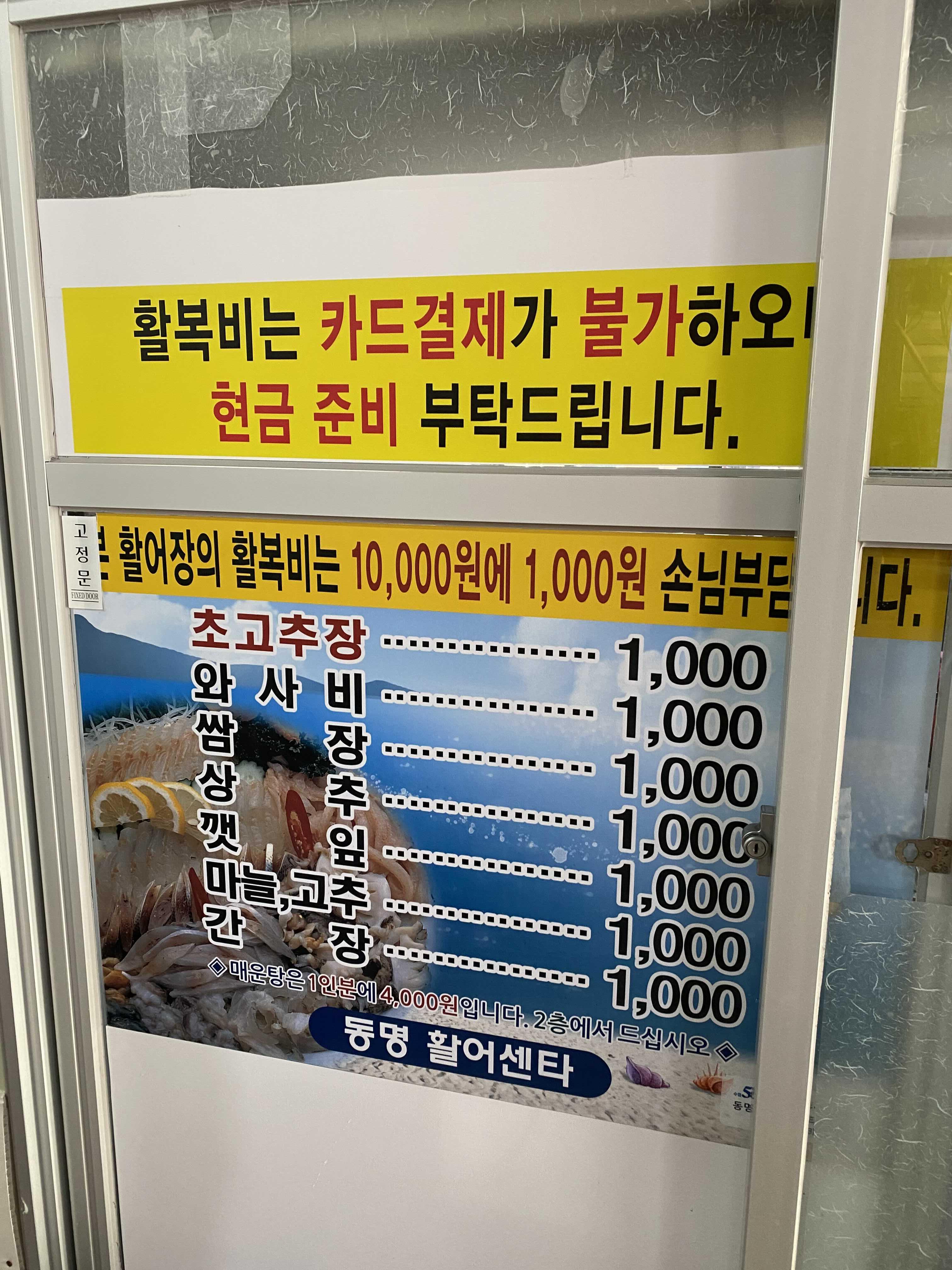 활복비는 카드결제가 불가능하다고 적혀있고 현금 준비를 하라고 적혀 있었고 나는 붉은대게 찌는 비용하고 회 활복하는 비용까지해서 총 5,000원을 내면 된다고 했다.