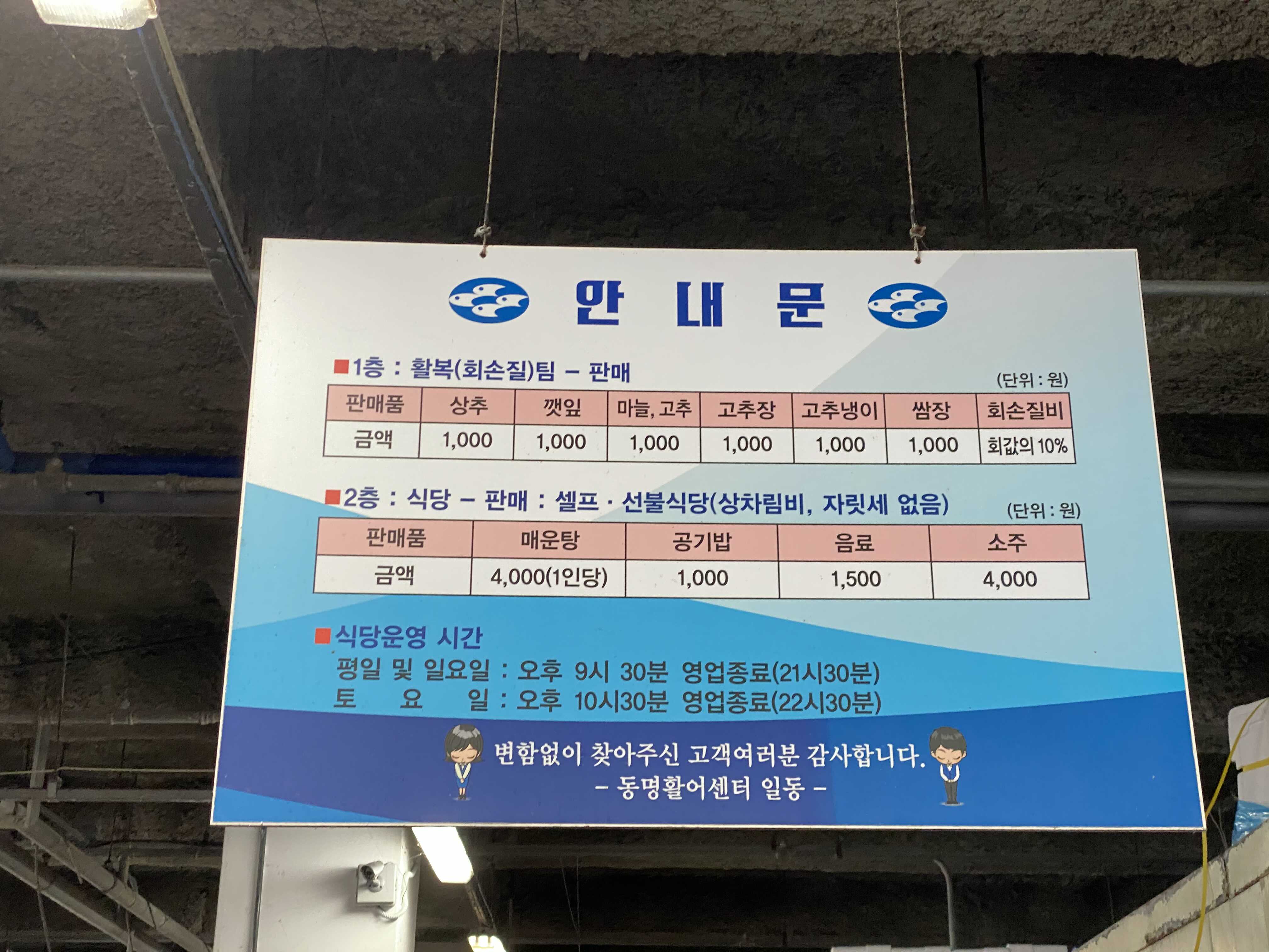 2층은 식당 판매 셀프 선불식당가 운영이 됐고 상차림비나 자릿세는 따로 없었다. 대신 매운당은 1인당 4,000원 공기밥은 천원 음료 1500원 소주 4000원 이렇게 해서 자율 식당으로 운영이 되고 있었다.
