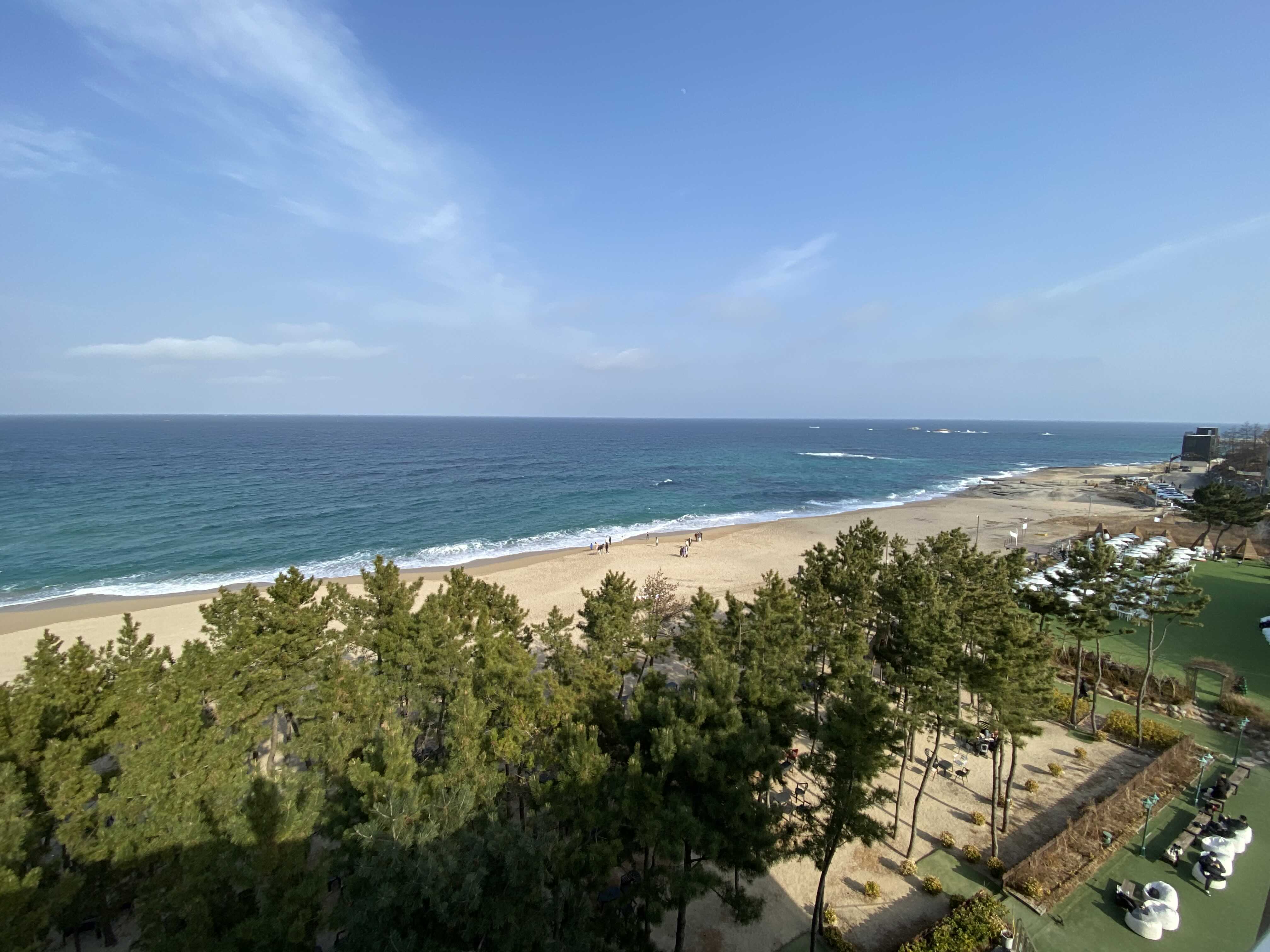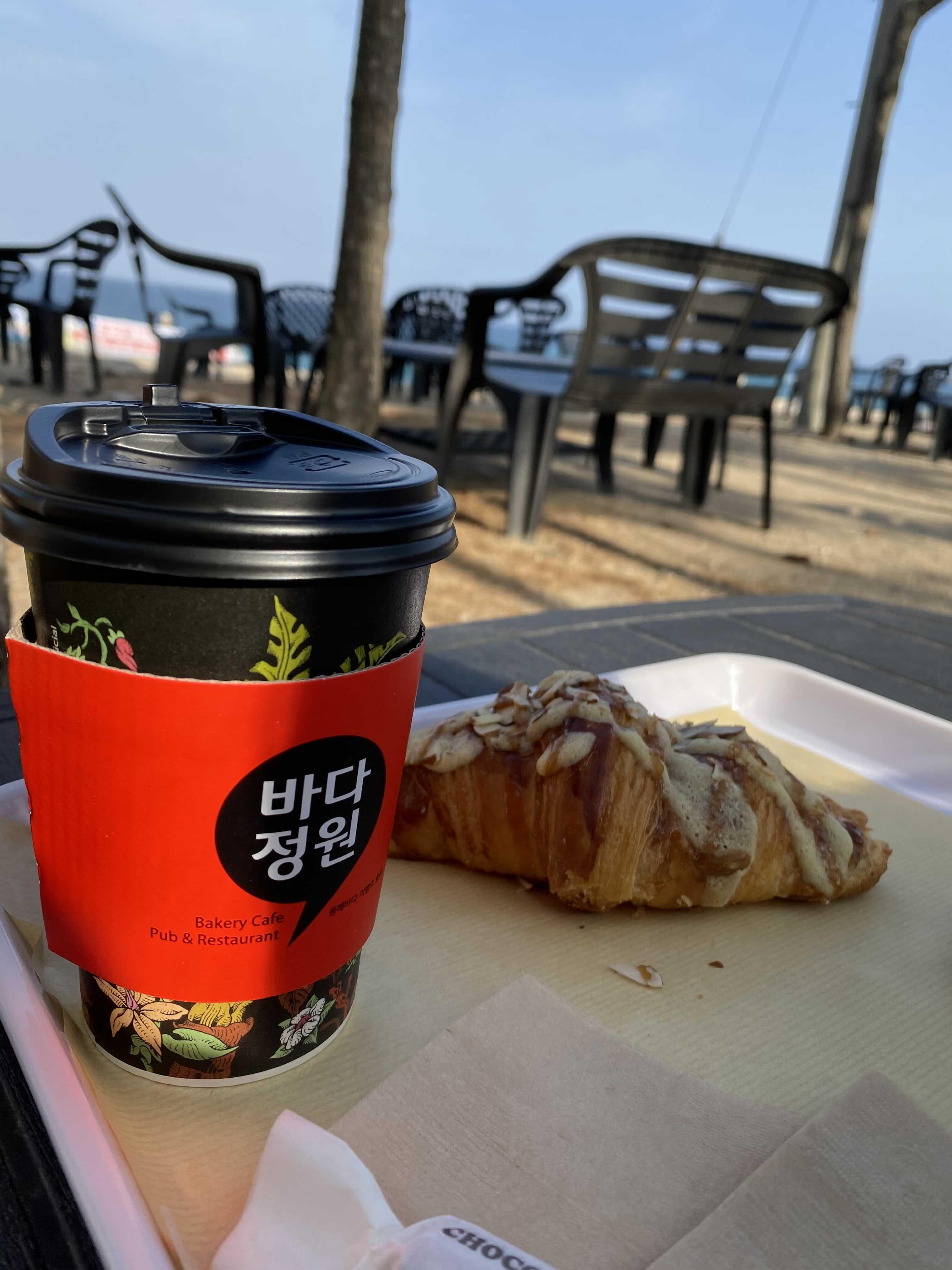 사람이 너무 많아서 야외 자리에 자리 잡고 바다를 보면서 커피 한잔 했네요.